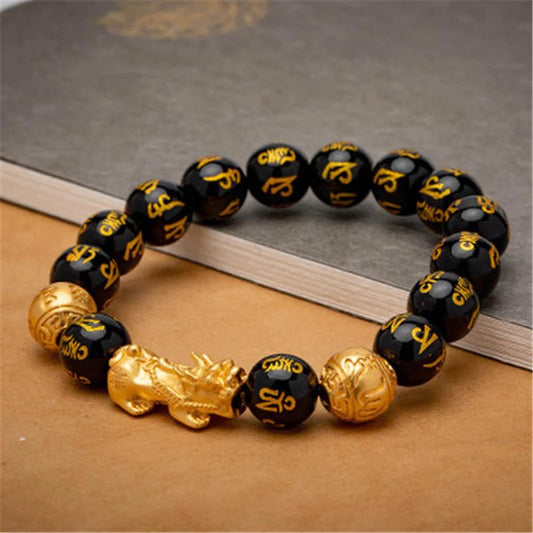 Black Obsidian Mantra Gold Bead Pixiu Wealth Bracelet