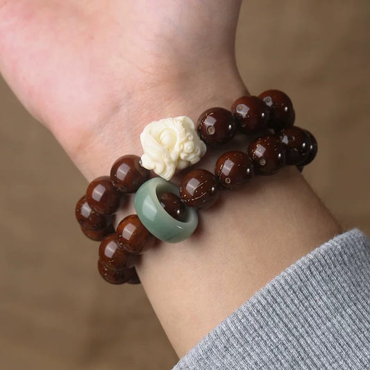 Natural Red Sandalwood Bodhi Seed Carved Lion Bracelet