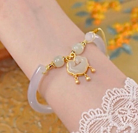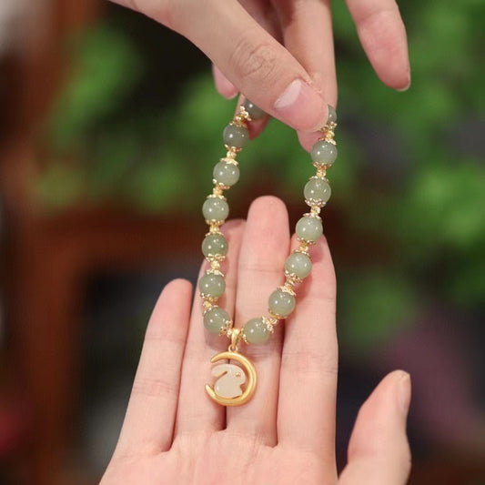 Natural Hetian Green Jade Rabbit & Moon Bracelet