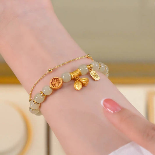 Natural Hetian Jade Lotus Double Layer Bracelet