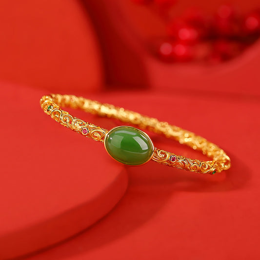 Natural Hetian Jade Filigree Hollow Wealth Bangle Bracelet