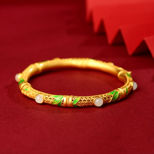 Natural Hetian Jade Enamel Cloud Filigree Hollow Bangle