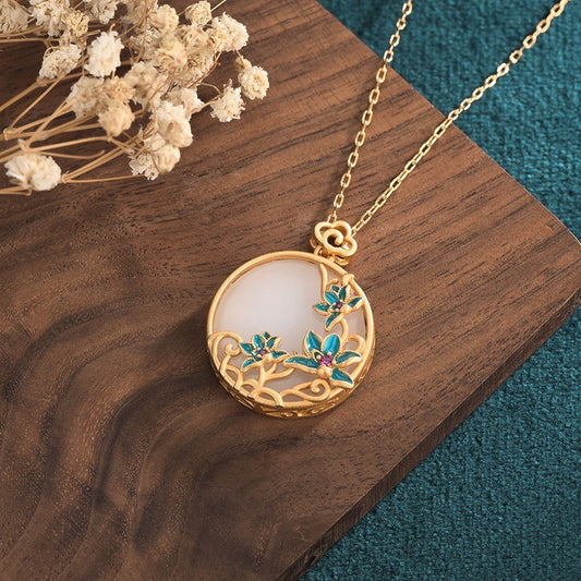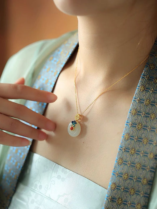 Feng Shui Enamel Flower Hetian Jade Pendant Necklace