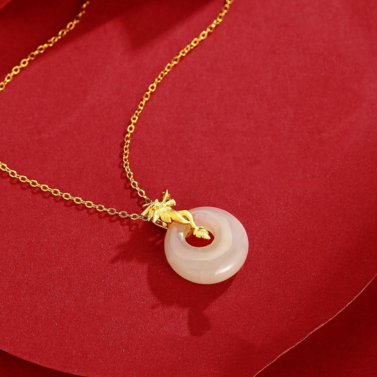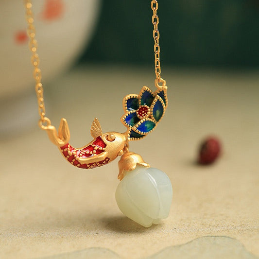 Feng Shui Lotus Pond Koi White Jade Necklace