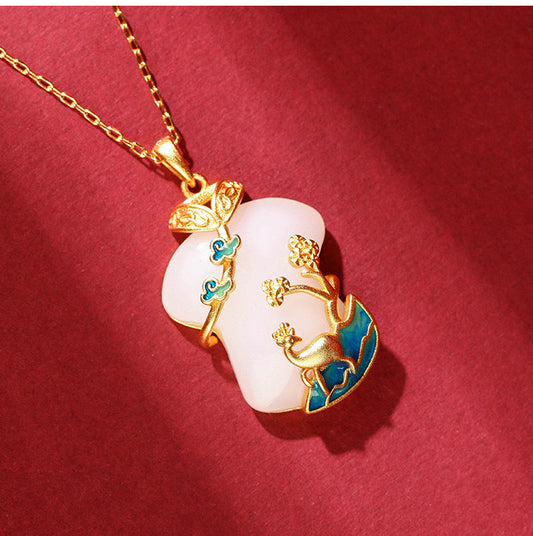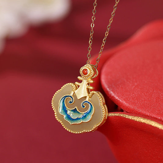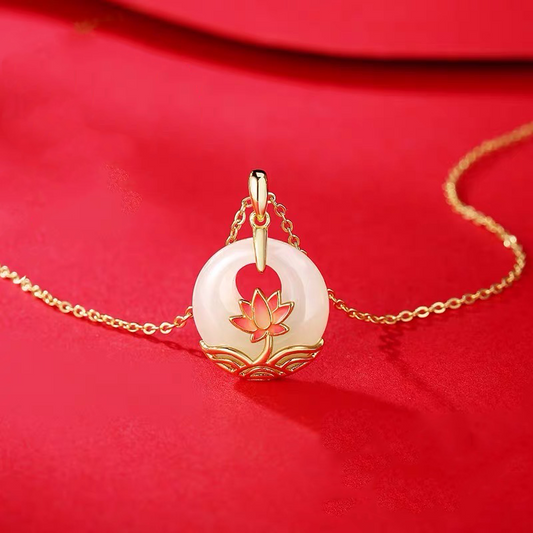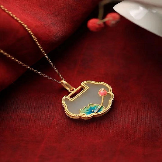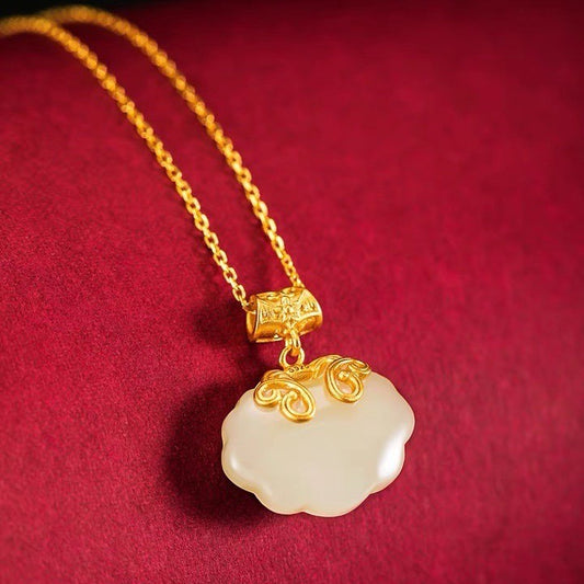 Natural Hetian Jade Longevity Lock Lotus Necklace