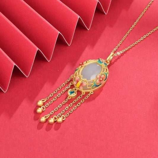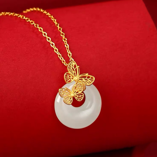 Natural Hetian Jade Longevity Lock Double Butterfly Necklace