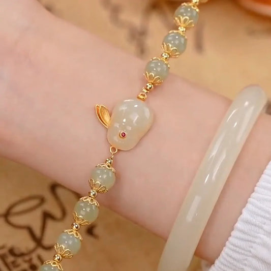 Natural Hetian Green Jade & Red Agate Lucky Rabbit Bracelet